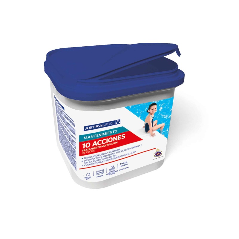 Nuevas tabletas multifuncionales de 250 gr que realizan las siguientes 10 funciones: Desinfectante, algicida, bactericida, algiestático, virucida, fungicida, floculante-coagulante, reducción nivel pH, estabilizante, anticalcáreo. No comburente.