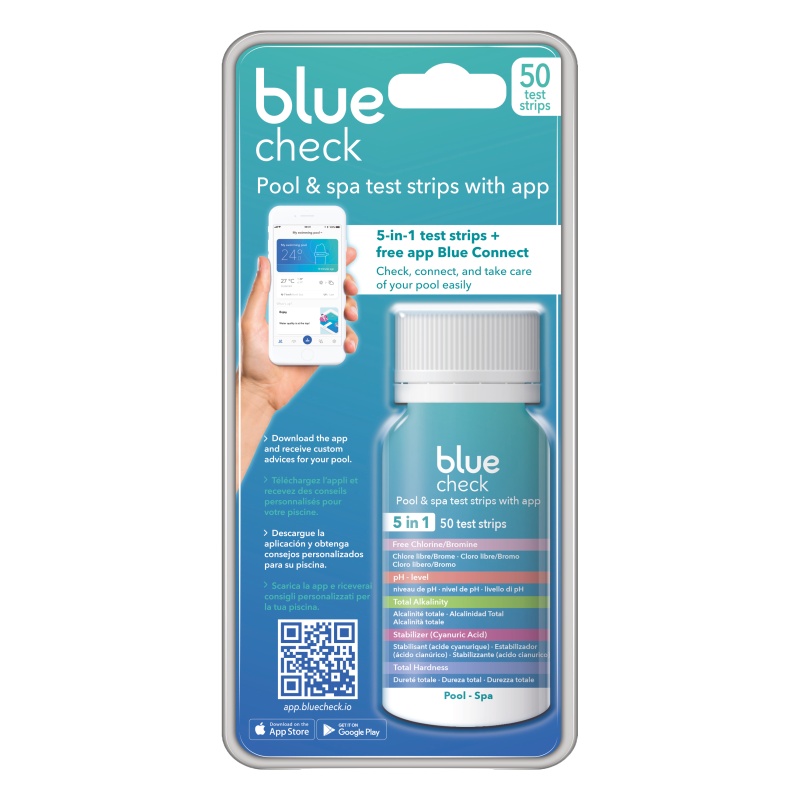Blue Check es un pack de 50 tiras analíticas para usarse con la aplicación Blue Connect que proporcionan al cliente una receta personalizada en el tratamiento de su piscina.