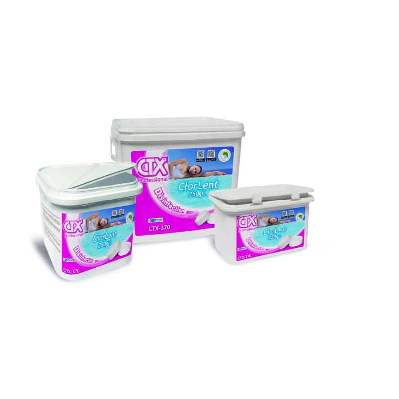 A) Colocar en los cestos de los skimmers 1 compacto de Tricloro CTX-370 por cada 15 m3 de agua cada 7 días.