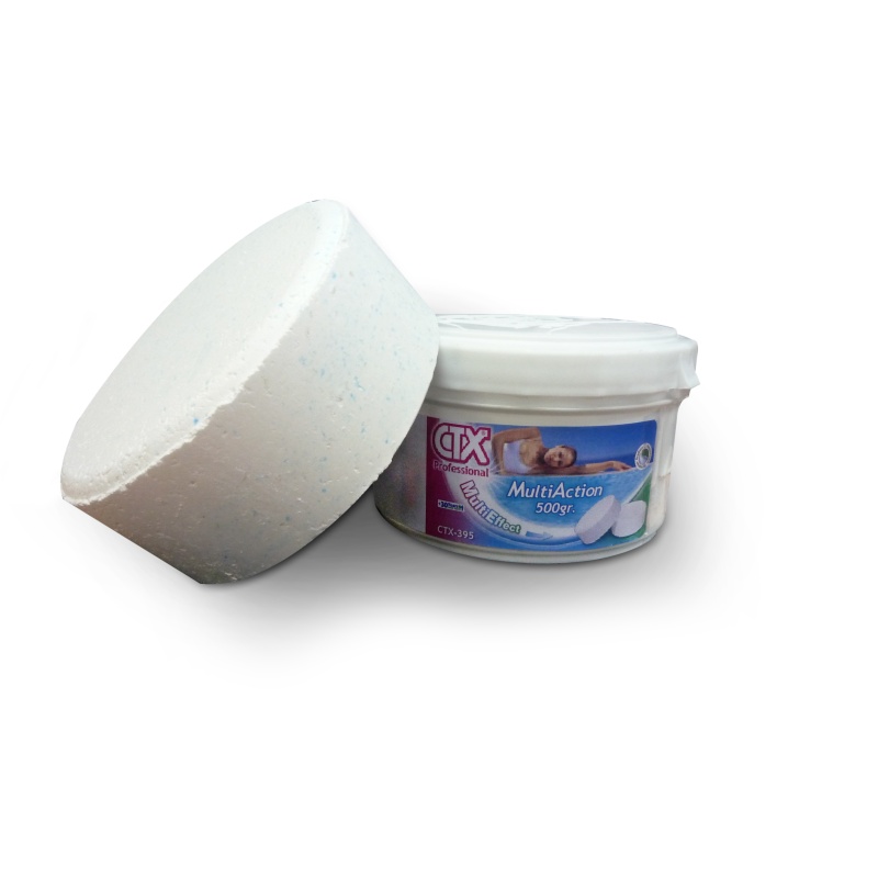 Multiacción sólido en tabletas de 500 grs., que con su sola aplicación en el agua de la piscina se consigue eliminar las bacterias, virus y microorganismos en general, evitar el desarrollo de las algas y mantener el agua transparente y cristalina.