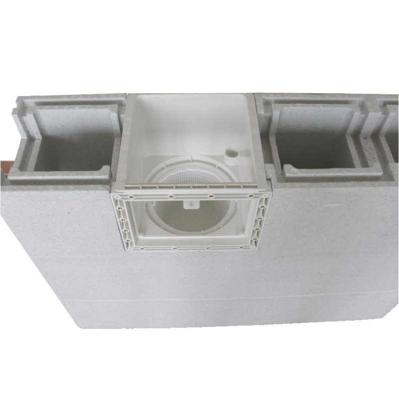 Nueva gama de skimmers de 17L aptos para instalarse en piscinas residenciales. Gracias a su poca longitud, 250mm. son ideales para instalarse en piscinas construidas en bloques de poliestireno expandido, además gracias a su configuración llevan el nivel del agua al borde de la piedra de coronación. Fabricados en ABS blanco con tratamiento UV incorpora compuerta, regulador de caudal y cesto de recogehojas. Caudal recomendado 7,5m³/h y instalar un skimmer cada 25 m² de superficie de lámina de agua. Conexiones inferiores de Ø63mm. y de 2″, conexión de agua sobrante de Ø 32 mm.